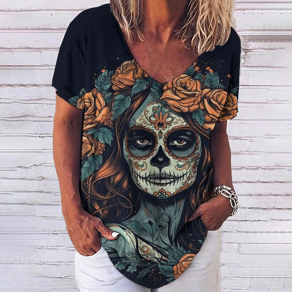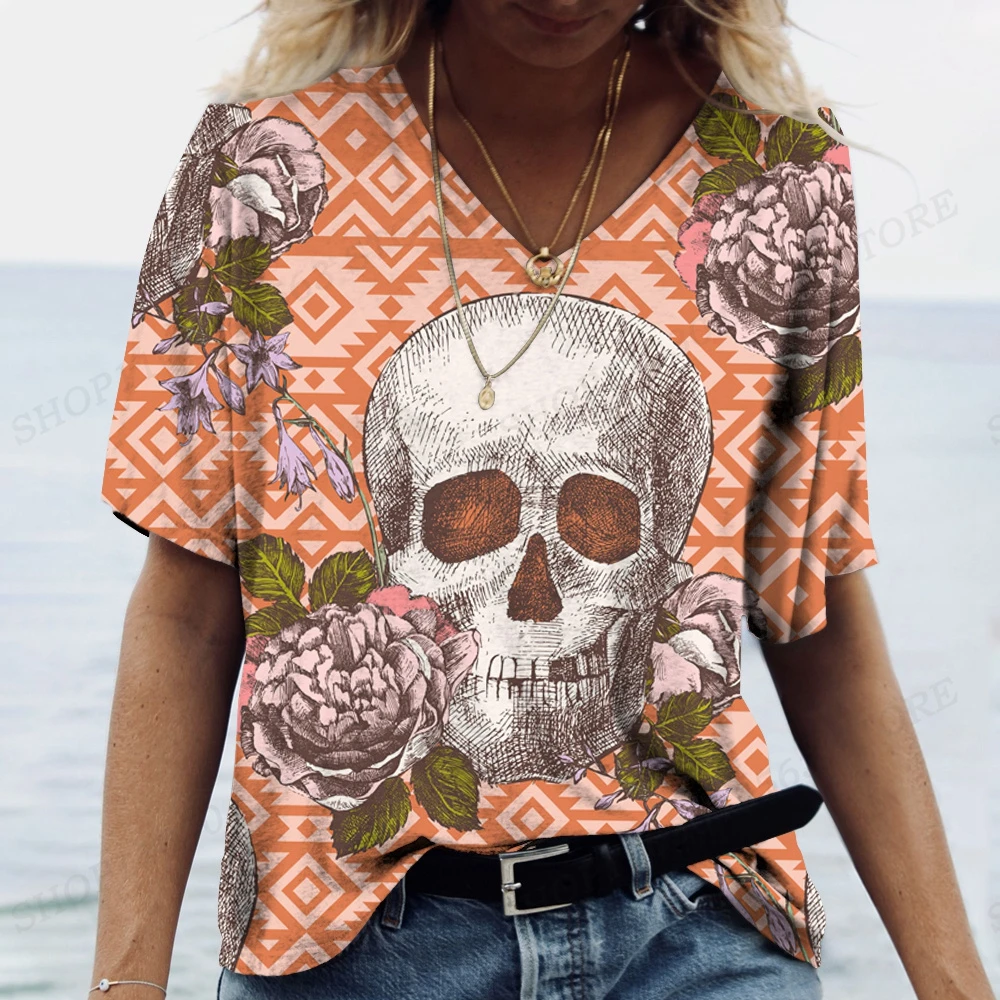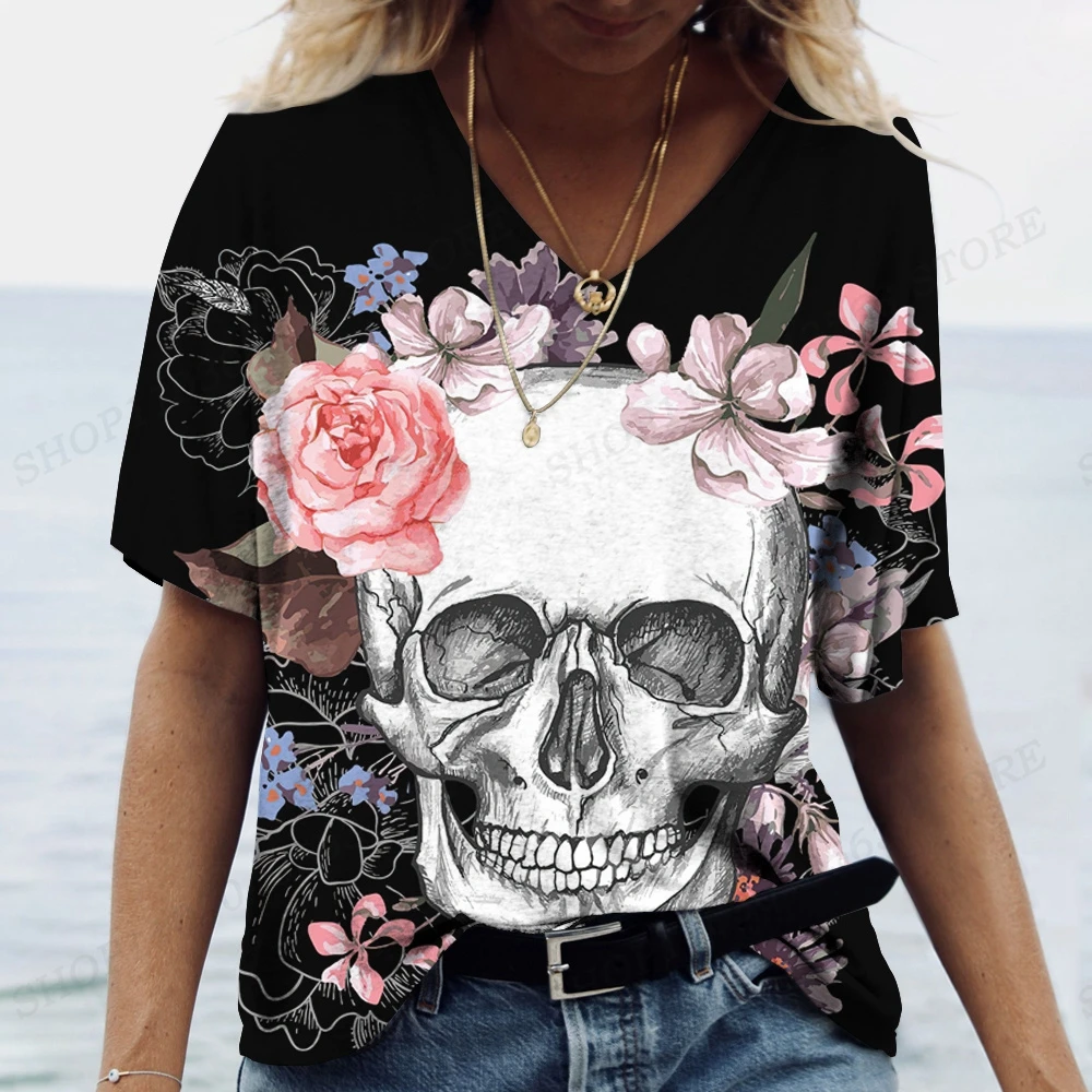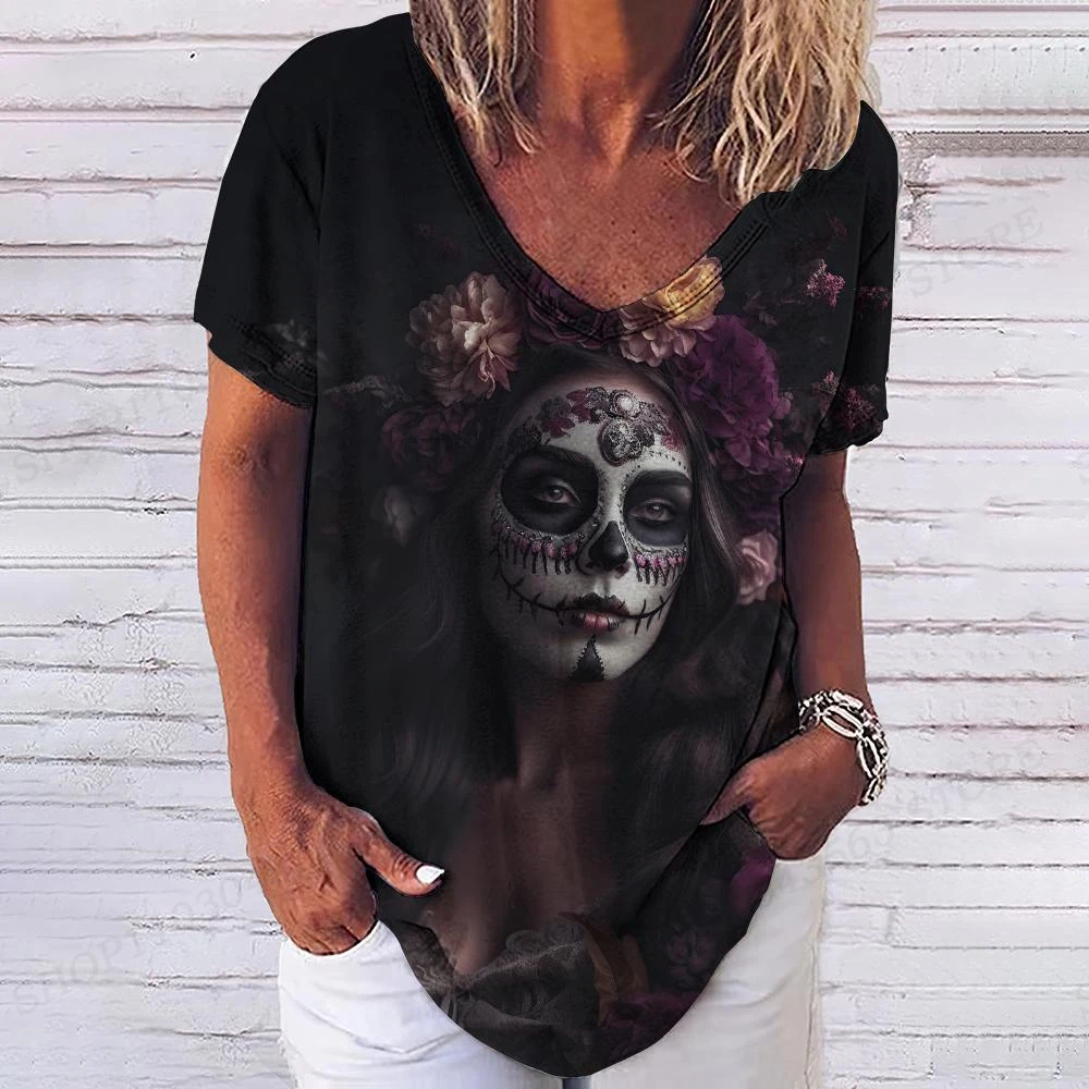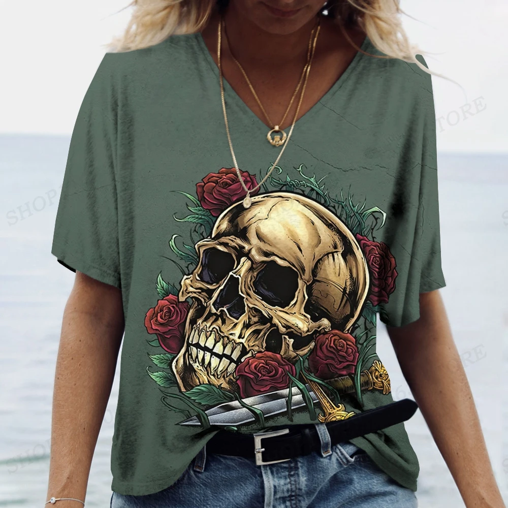 Horror Skulls 3d Print Tshirt Women Fashion T-shirts Vintage Tops Tees Skull Tshirt Ladies Tops V-Neck Tshirt Oversized Clothing