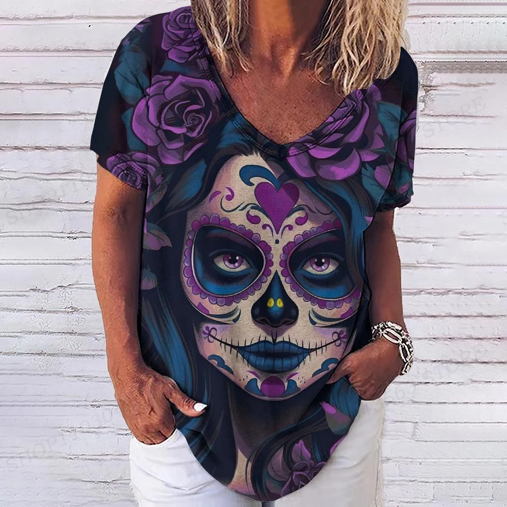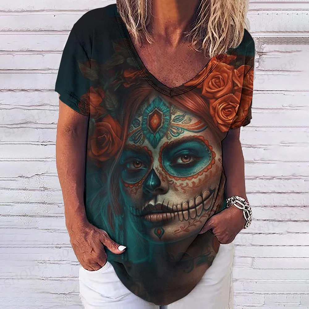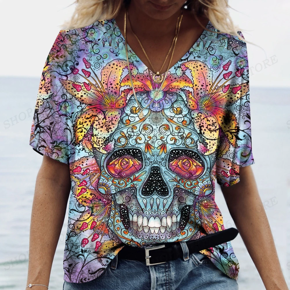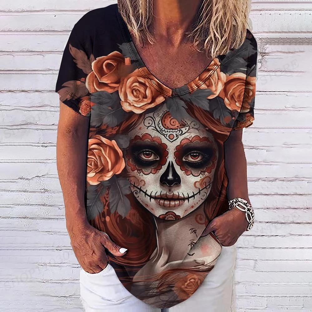 Horror Skulls 3d Print Tshirt Women Fashion T-shirts Vintage Tops Tees Skull Tshirt Ladies Tops V-Neck Tshirt Oversized Clothing