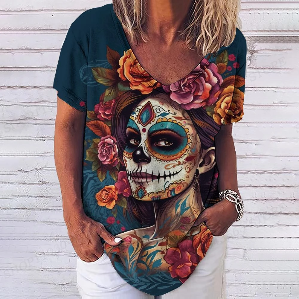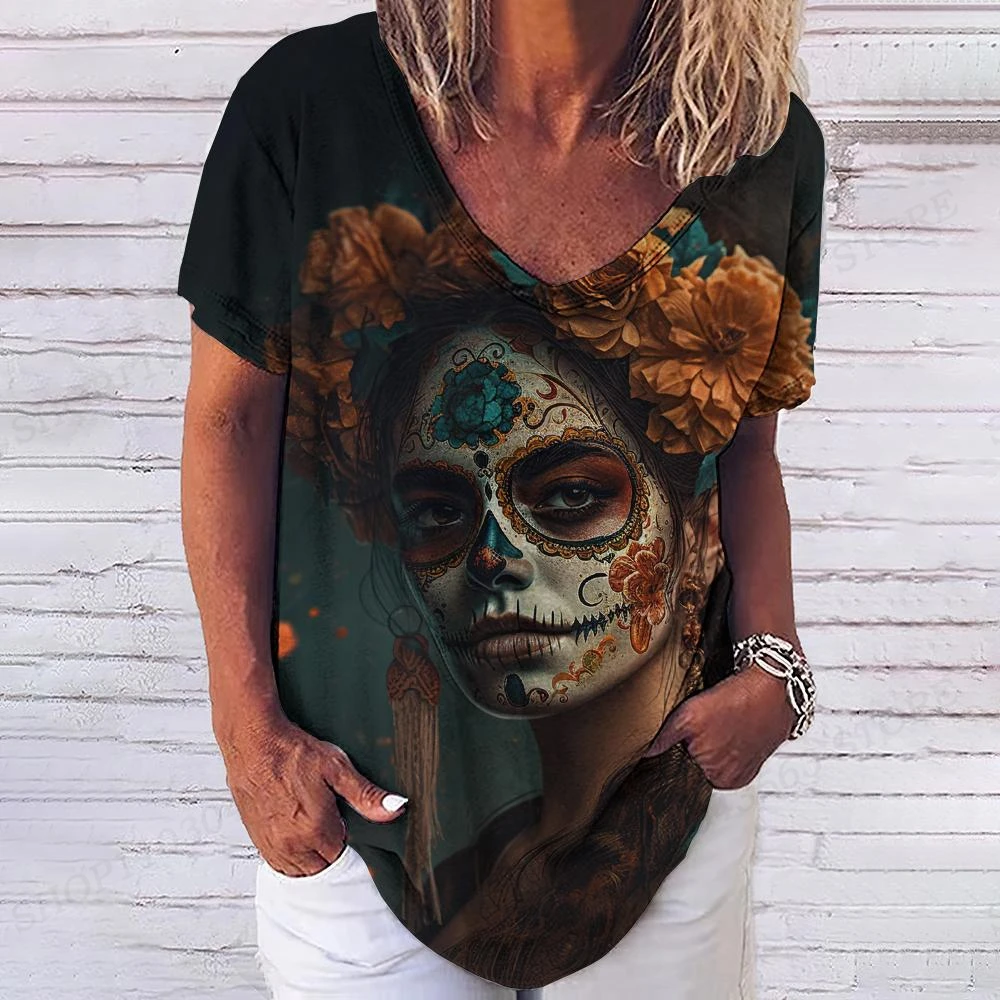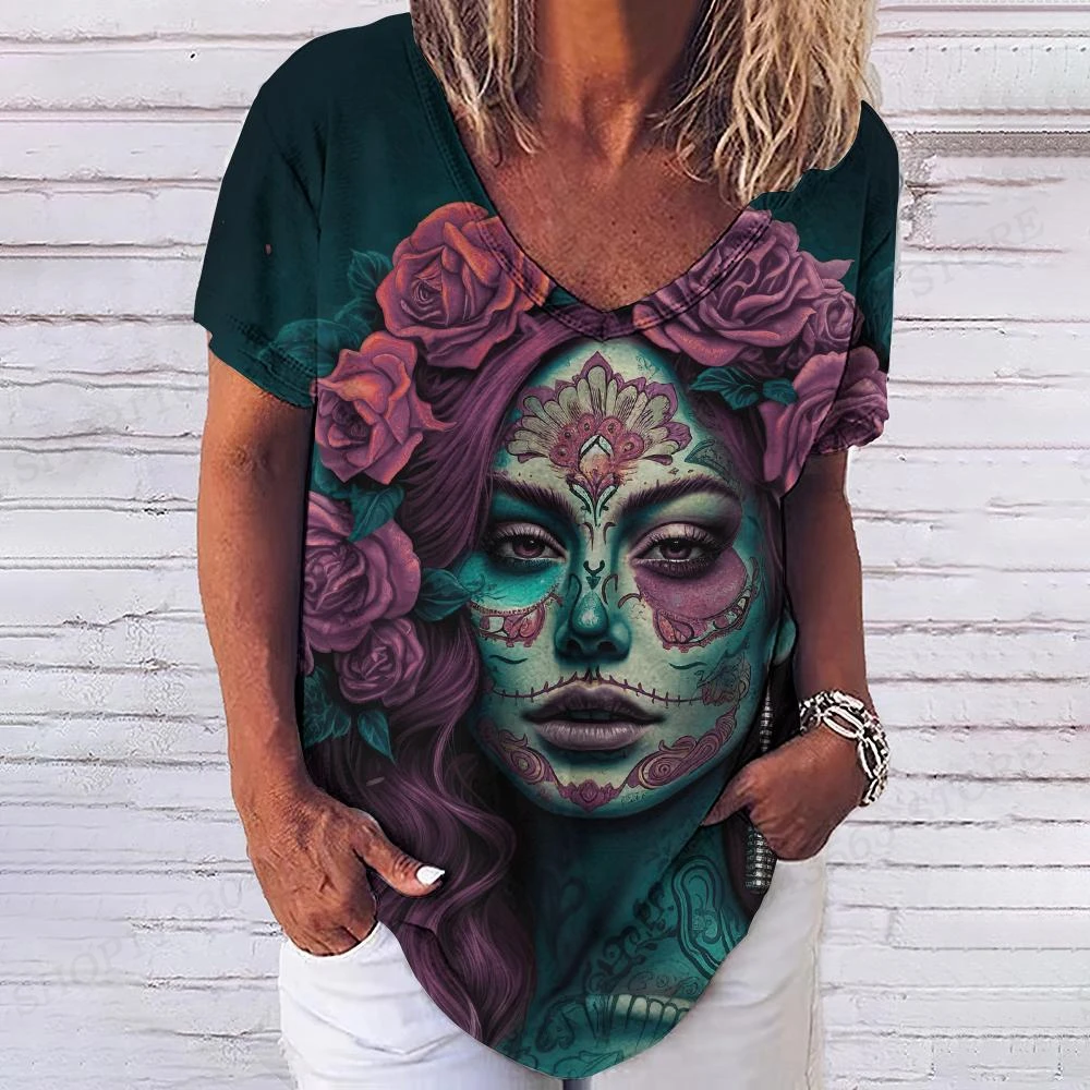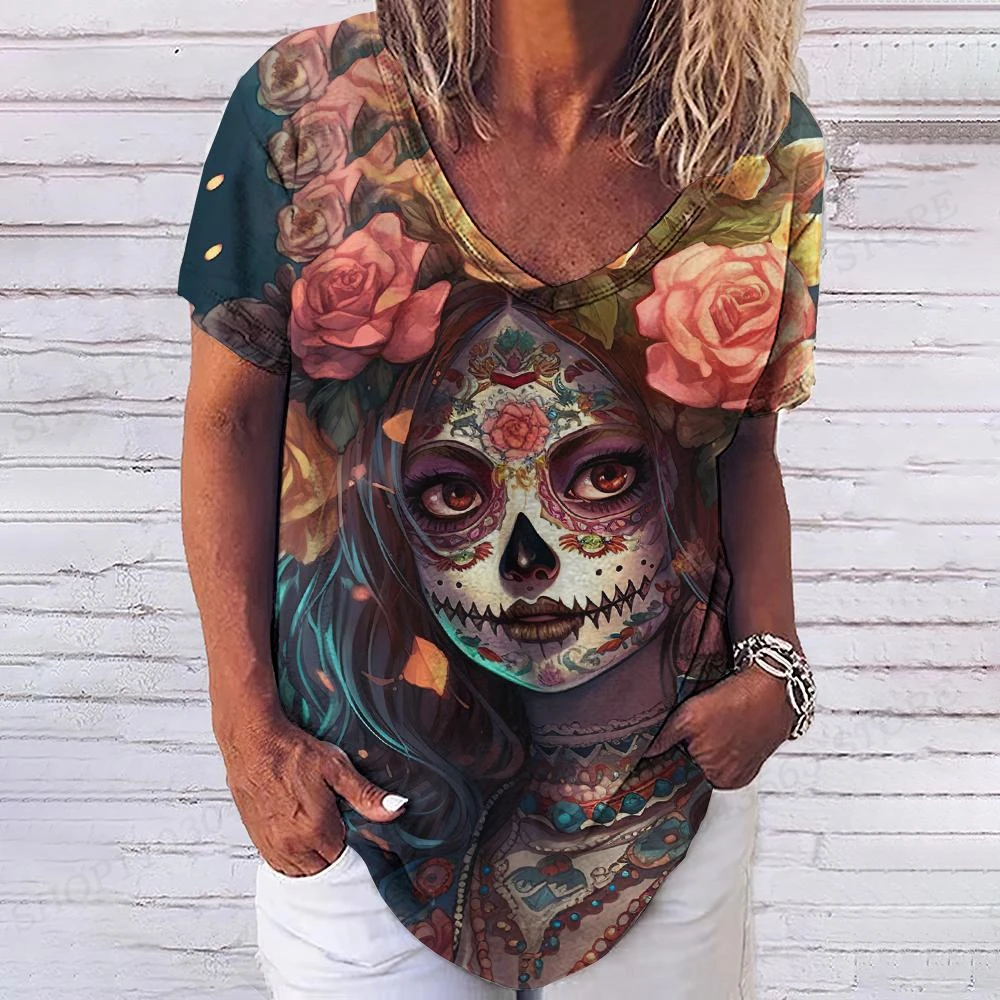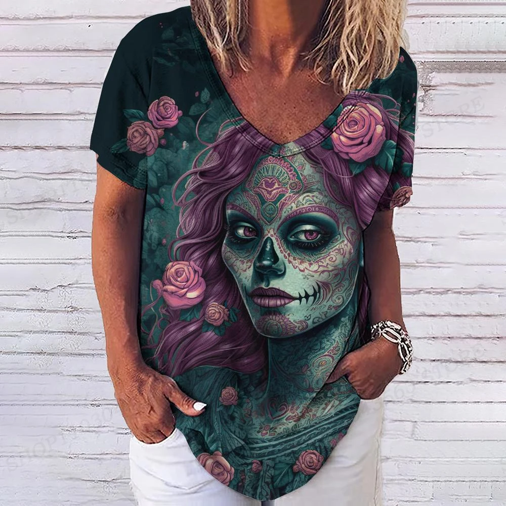 Horror Skulls 3d Print Tshirt Women Fashion T-shirts Vintage Tops Tees Skull Tshirt Ladies Tops V-Neck Tshirt Oversized Clothing